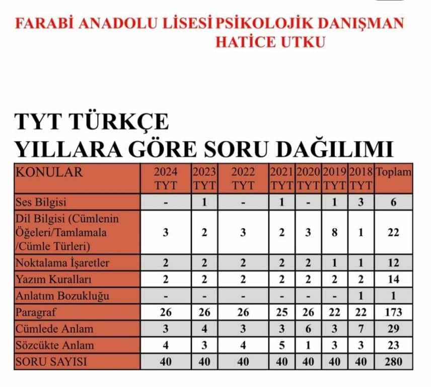 Okul psikolojik danışmanımız Hatice UTKU tarafından hazırlanan TYT Konu ve soru dağılımlarıdır. Öğrencilerimize iyi çalışmalar dileriz.